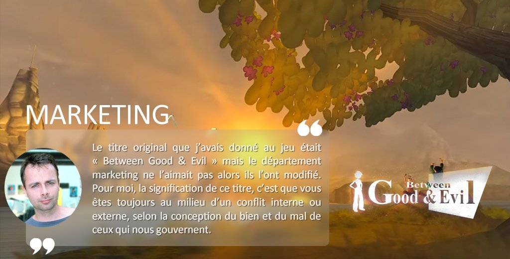 Je préférais aussi "Between Good and evil" pour ce qu'il a cité justement, ça correspond mieux au jeu, mais bon, souvent les gens ne peuvent pas faire leurs jeux comme ils le veulent, plein de trucs sont retirés où modifier, comme pour Peter Molyneux et Fable... J'ai lu "Tales of Albion" et au moins 70% de l'histoire n'est pas dans les jeux.